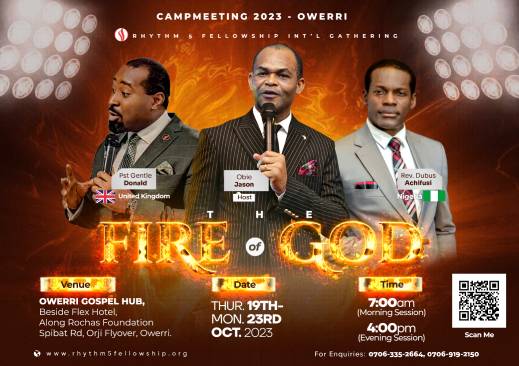 Rhythm 5 Fellowship is the umbrella organization that includes a network of Churches, Campus Ministry, Healing Center, Foreign Missions, Miracles Today Campaign, Rhythm 5 Publishing house, Dorcas Alternative Initiative, Healing & Prophetic Prayer Room (HPPR), Special Missions, Above Rubies Ministry, etc. Rhythm 5 Fellowship International is under the leadership of Obie Jason Iwuchukwu.